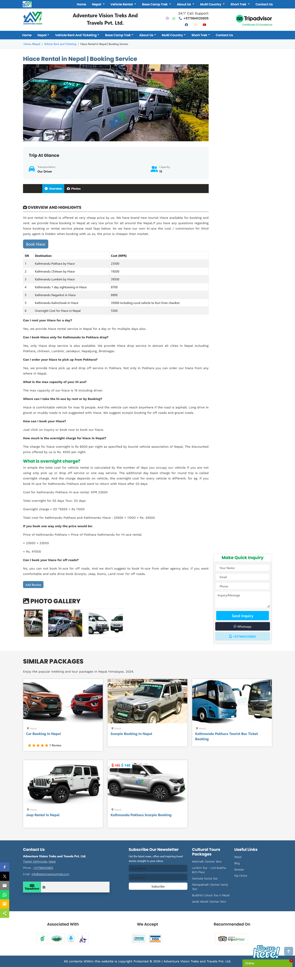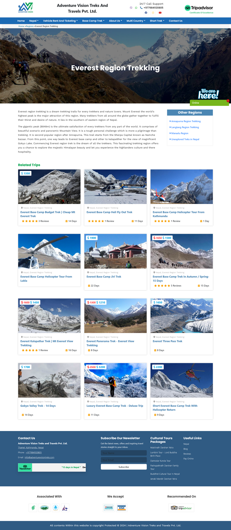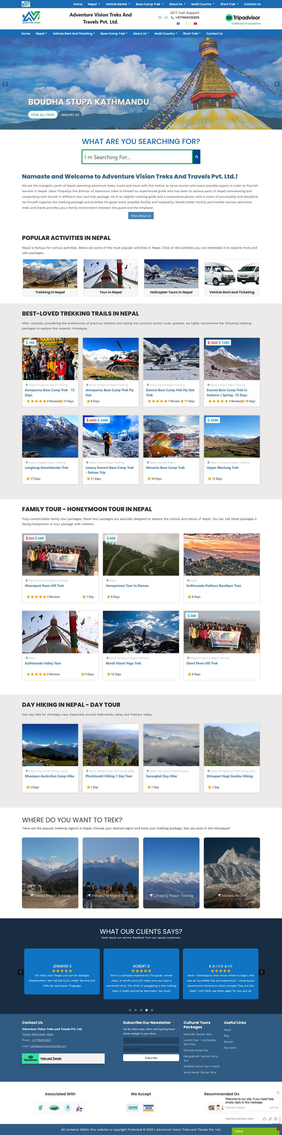 Adventure Vision Treks and Expedition's travel tour trekking portal offers a comprehensive platform for travelers seeking unforgettable adventures in Nepal. Our portal provides a seamless booking experience for various services, including tour packages, helicopter tours, adventure activities, vehicle rentals, and trekking expeditions. Here's an overview of the key features: