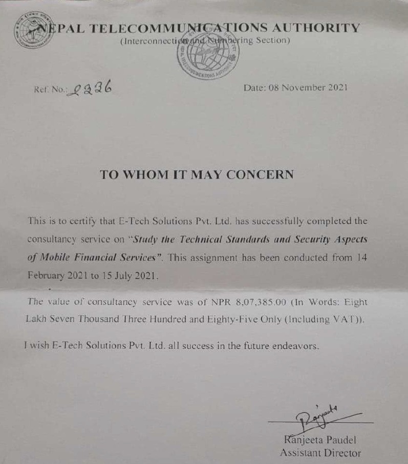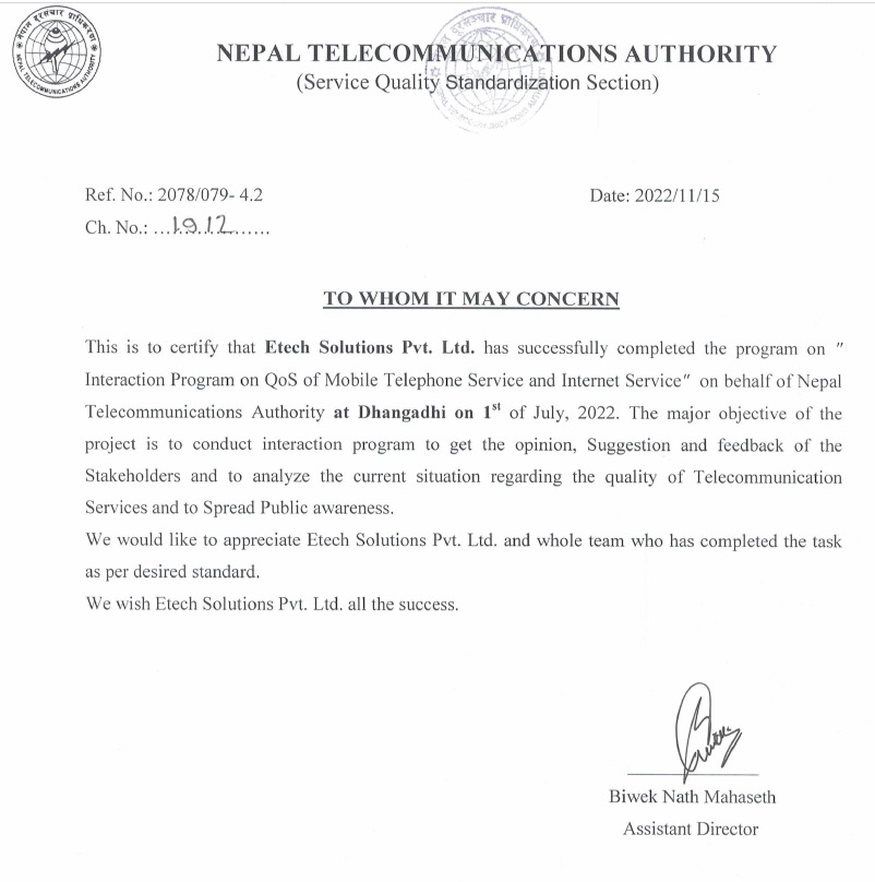 Nepal Telecommunications Authority is the telecommunications regulatory body of Nepal. It is an autonomous body established on Feb 1998 in accordance with Telecommunications Act, 1997 and Telecommunications Regulation, 1998. It’s objective is to create a favorable and competitive environment for the development, expansion and operation of telecommunications services with the private sector participation in Nepal.
